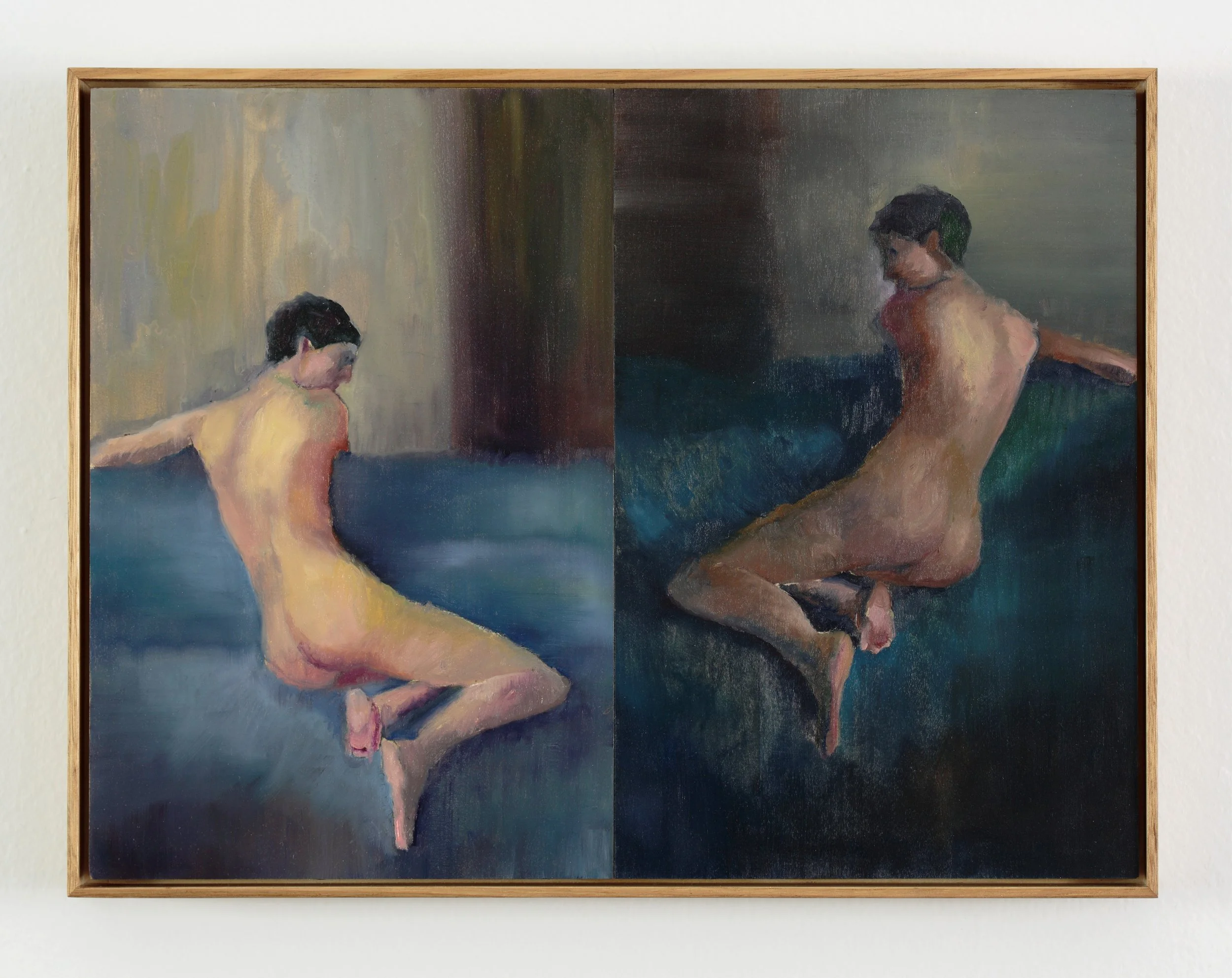 Artwork by Alex Dillon, Blue Love Seat, 2026 Oil on board 30x40cm